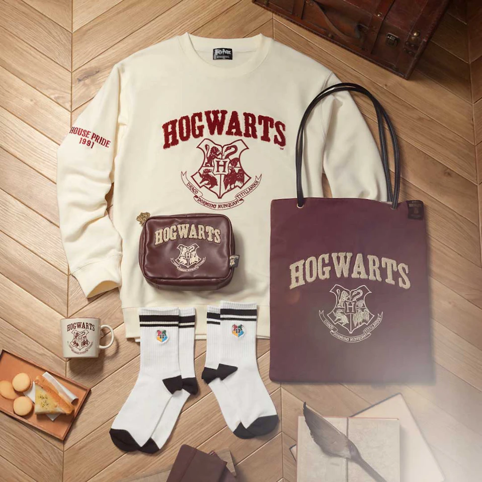 リバーシブルのトートバッグ、ホグワーツエンブレム付きのポーチや胸元に大きなサガラ刺繍を施したスウェットと男女で楽しめる2サイズ展開のラインソックスなどのアパレル用品のほか、お家でハリー・ポッターの世界観を味わえるマグカップと全5種のラインアップです。