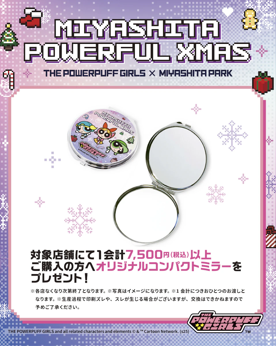 また、対象店舗にて1会計7,500円(税込)以上ご利用の方へ、THE POWERPUFF GIRLS × MIYASHITA PARKのオリジナルコンパクトミラーを1個プレゼント。