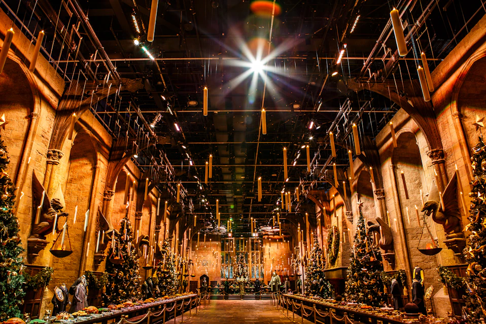 高さ5メートルを超えるツリーや、七面鳥やケーキなどのご馳走が並ぶ大広間へ──金色の装飾や暖炉まわりのリースが華やかに彩り、映画のシーンさながらの光景が目の前に。一歩足を踏み入れた瞬間、温かなクリスマスの世界に包まれます。