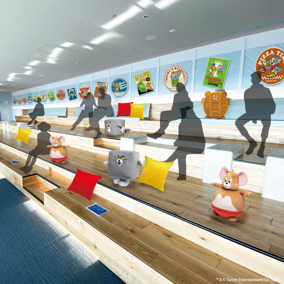 「トムとジェリーボウリング -by VILLAGE VANGUARD-」では、ボウリング場を舞台にトムとジェリーの世界観を楽しめるユニークな空間で、限定グッズの販売やミニゲーム体験、ワークショップなどを開催します。「トムジェリマーケット」では、ぬいぐるみ、雑貨、アパレルなどのグッズを販売いたします。